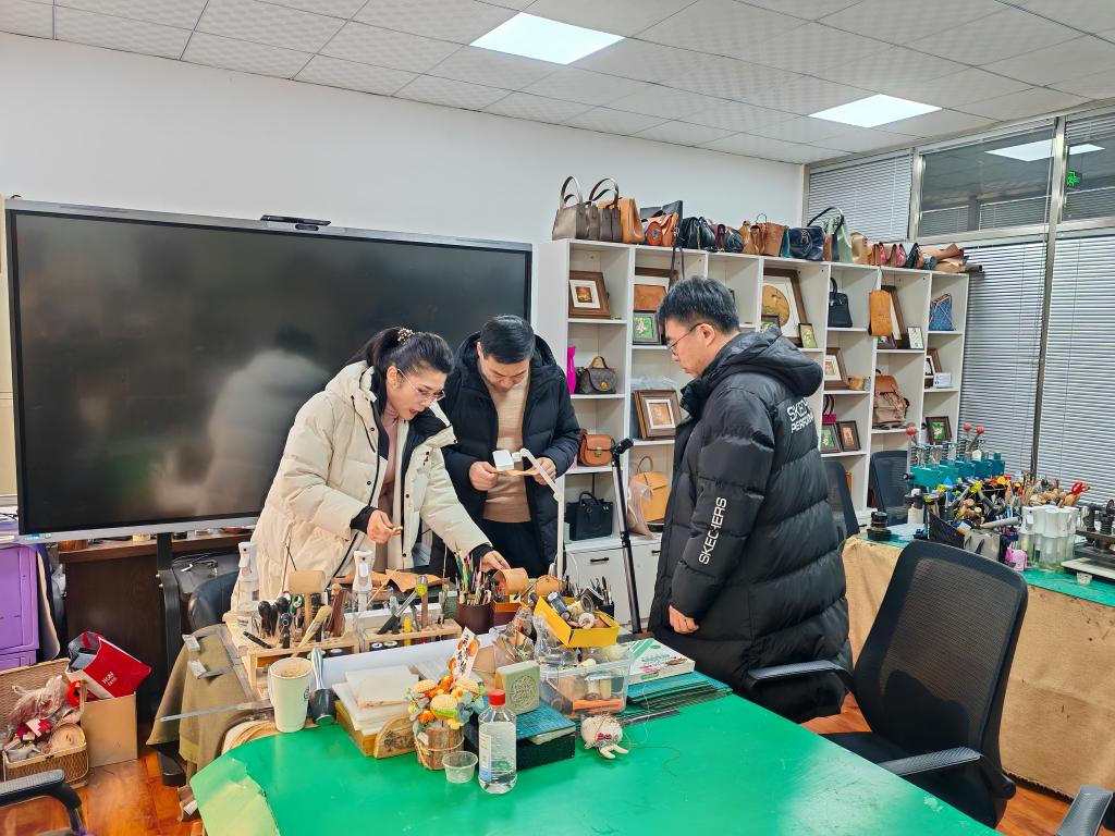 调研过程中,郑方明认真了解了师生创作过程,详细询问了师生作品设计理念、制作工艺和市场转化情况。在剪纸工作室,他对师生将传统剪纸技艺与现代设计语言相结合的创新实践表示赞赏;在皮雕工作室,他仔细了解了皮革工艺的传承发展与创新应用,对工作室在材料创新和工艺改良方面取得的成果给予肯定。