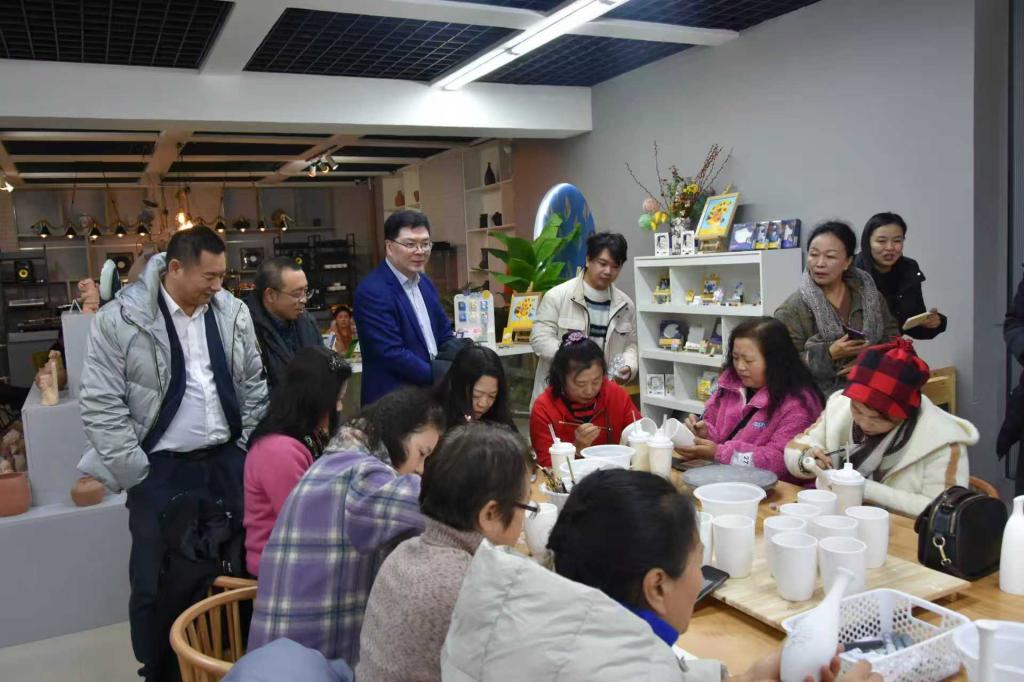 仪式结束后,与会嘉宾与学员代表先后参观了剪纸艺术设计与创作工作室和双创融合示范基地,近距离感受了传统剪纸艺术的魅力,详细了解了我校在文旅创意设计双创融合项目培育与成果转化方面的特色实践。最后,全体人员来到陶艺体验馆,在黄志欣老师的专业指导下,参与了陶艺制作体验活动。