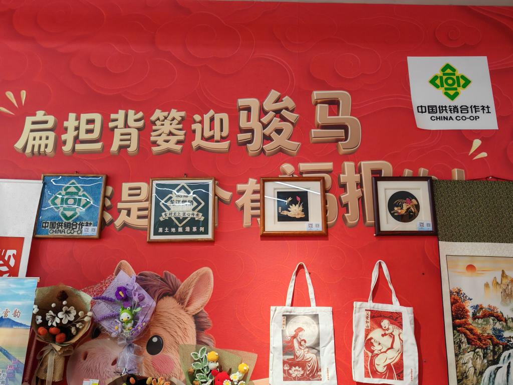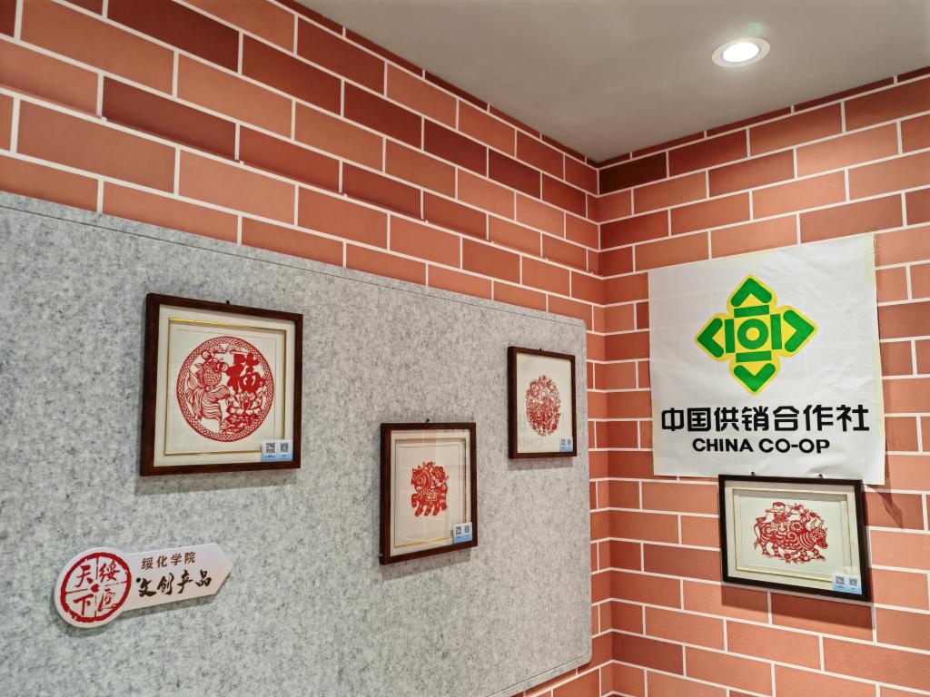 近日,我校师生创作的剪纸、粮食画、麦秸画等非遗文创作品正式入驻“黑龙江省供销社·食趣空间”中央大街门店销售。
